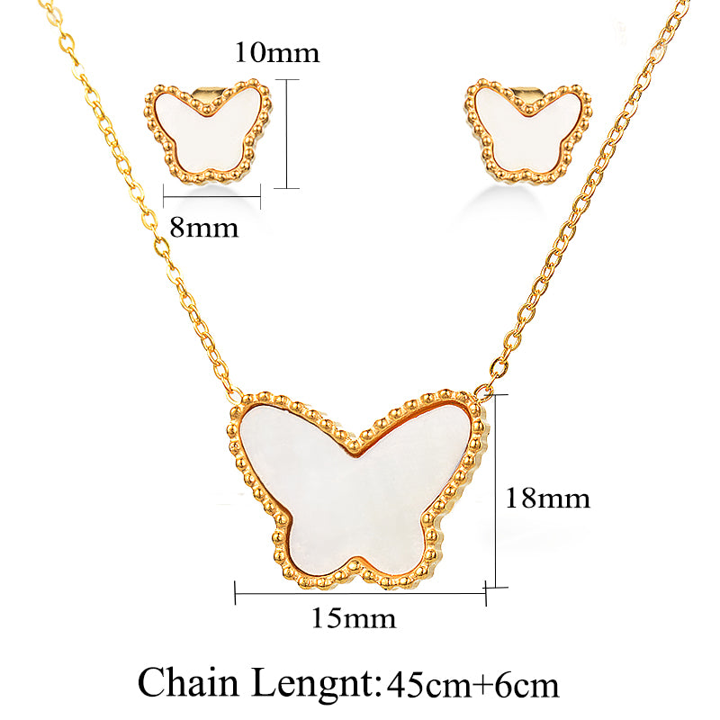 Tarnish free Trendy Minimalist Gold Mother of Pearl Butterfly Necklace and Earring Set. This timeless Necklace and Earring Jewellery set is a must have to add to your elegant luxury jewellery collection.